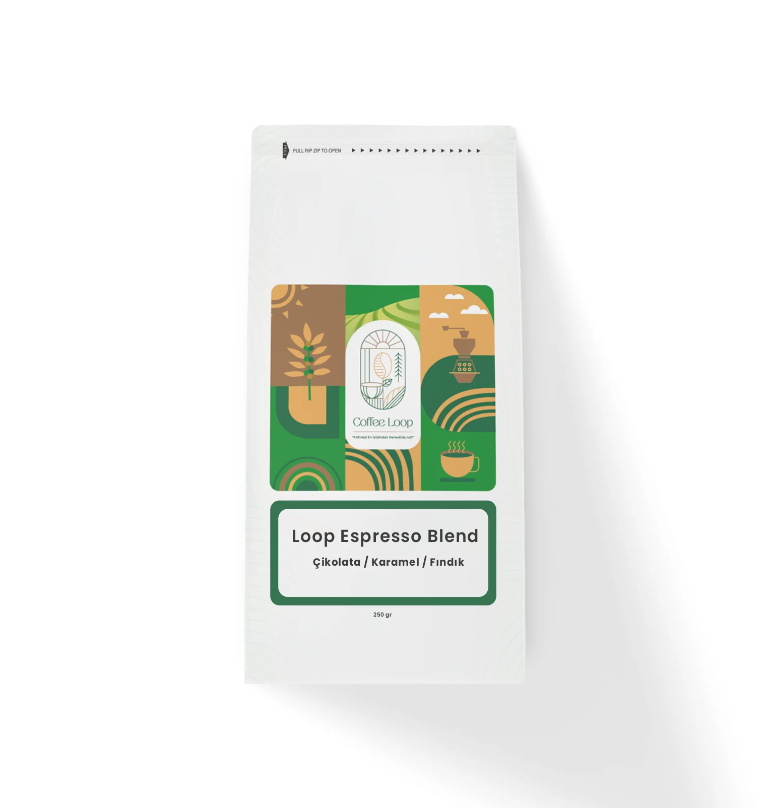 Loop Blend kahvesi, 250g'lık paketiyle yoğun ve aromatik. Farklı bölgelerden seçilen çekirdeklerin mükemmel karışımı. Kahve tutkunları için ideal.